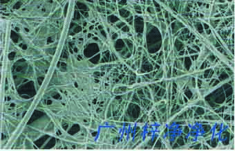 以上图片的放大倍数为1000倍,这些图片说明了与传统高效玻璃纤维滤纸(图B)相比,PTEF滤纸(图A)具有更细的纤维直径及更均匀的构造。