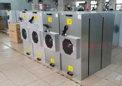 2、FFU设有初、高 效两 级过滤网。风机从FFU顶部将空气吸入并经初、高效过滤器过滤,过滤后的洁净空气在整个出风面以0.45M/S±20%的风速匀速送出。适用于在各 种环境中获得高级别的洁净环境。