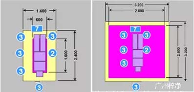 德国权威的研究机构罗伯特-科赫研究所认为,送风天花形成的保护区域必须包含手术台与器械桌,这要求高度无菌手术室(相当于德国标准Ia级)送风天花的保护区域面积至少维持在2.8m×2.8m,德国2008年修订了标准DIN1946第4部分,规定送风天花的出风面积3.2m×3.2m。当然对于一般无菌手术室(相当于德国标准Ib级)的送风天花只要求保护手术台,即保护区域为2.0m×0.8m,出风面积需为2.4m×1.8m。如图5、图6所示。