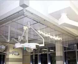 至于德国标准推荐的(不是规定)送风天花围挡,其要求不同于以往所使用的围挡。以前增设的围挡是为了使低速气流能送下来,围挡材料大多为塑料布,常因气流流动产生静电而吸附尘埃,增加了清洁的工作量。如今采用围挡是保护高速气流流动过程中维持低紊流度,围挡材料较为高级、结构较为复杂(见图7),或与医疗气体供气桥架结合在一起(见图8),形成了新型的送风装置。